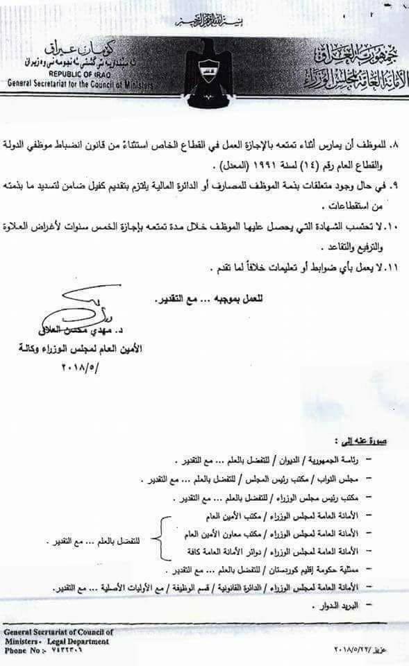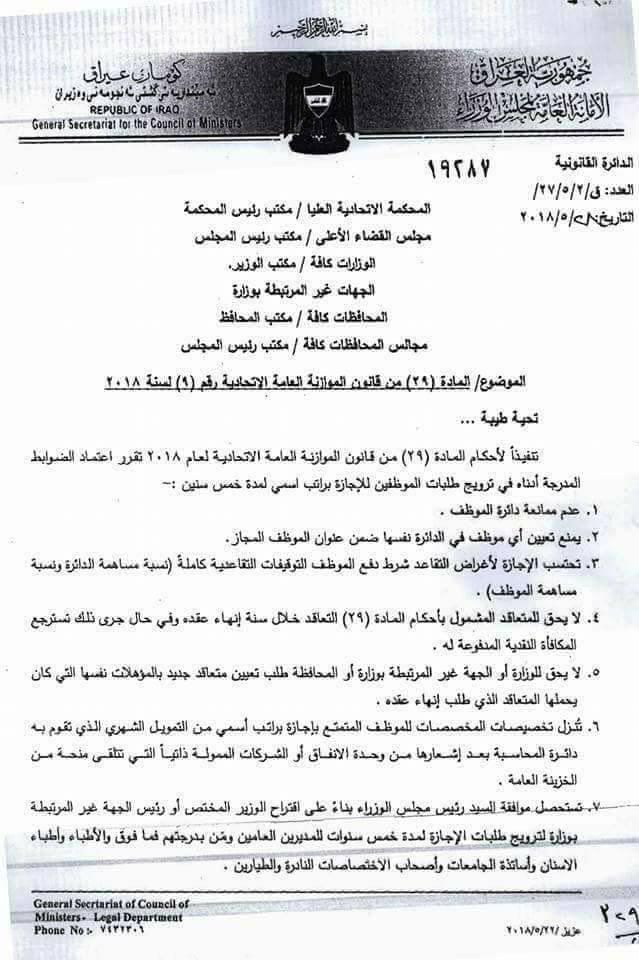 العراق _ الكوثر: اصدرت الامانة العامة لمجلس الوزراء في العراق ضوابط ترويج طلبات الموظفين اجازة لخمس سنوات بالراتب الاسمي.