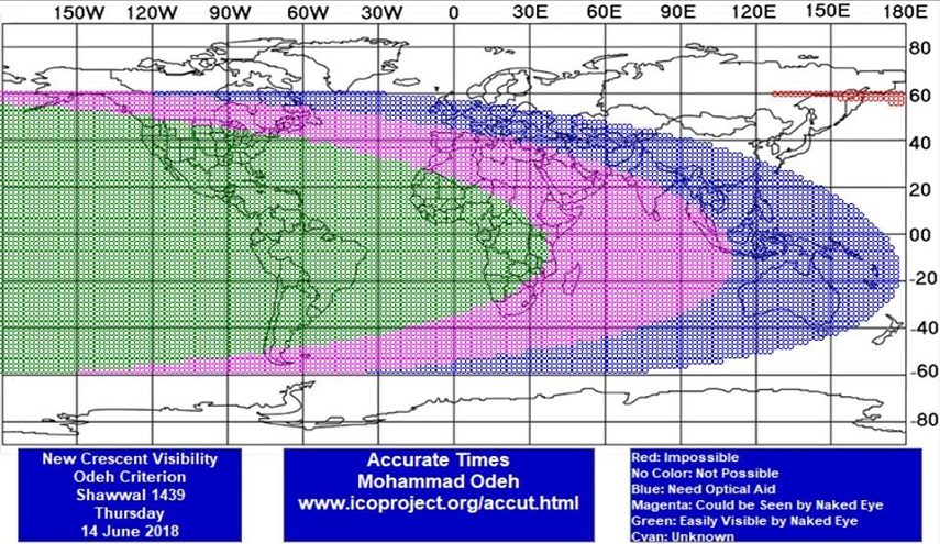 وذكرت صفحة أرصاد العراق على الـ"فيسبوك" اليوم 5 حزيران 2018 أنه یتوقع أن تكون احداثيات هلال شهر شوال مساء الخميس 15-6-2018 كالاتي:-