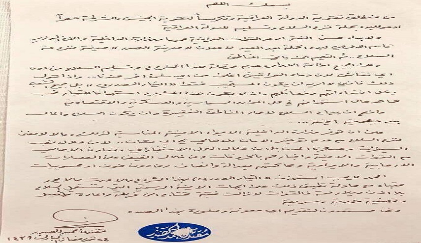 وأضاف أنه "لابداء حسن النية ادعو القوات العراقية عموماً ووزارة الداخلية والاخ الوزير قاسم الاعرجي لبدء الحملة بعد العيد لاعلان ((مدينة الصدر)) مدينة منزوعة السلاح... ثم التعميم الى باقي المناطق".