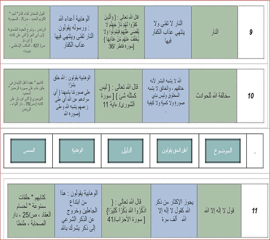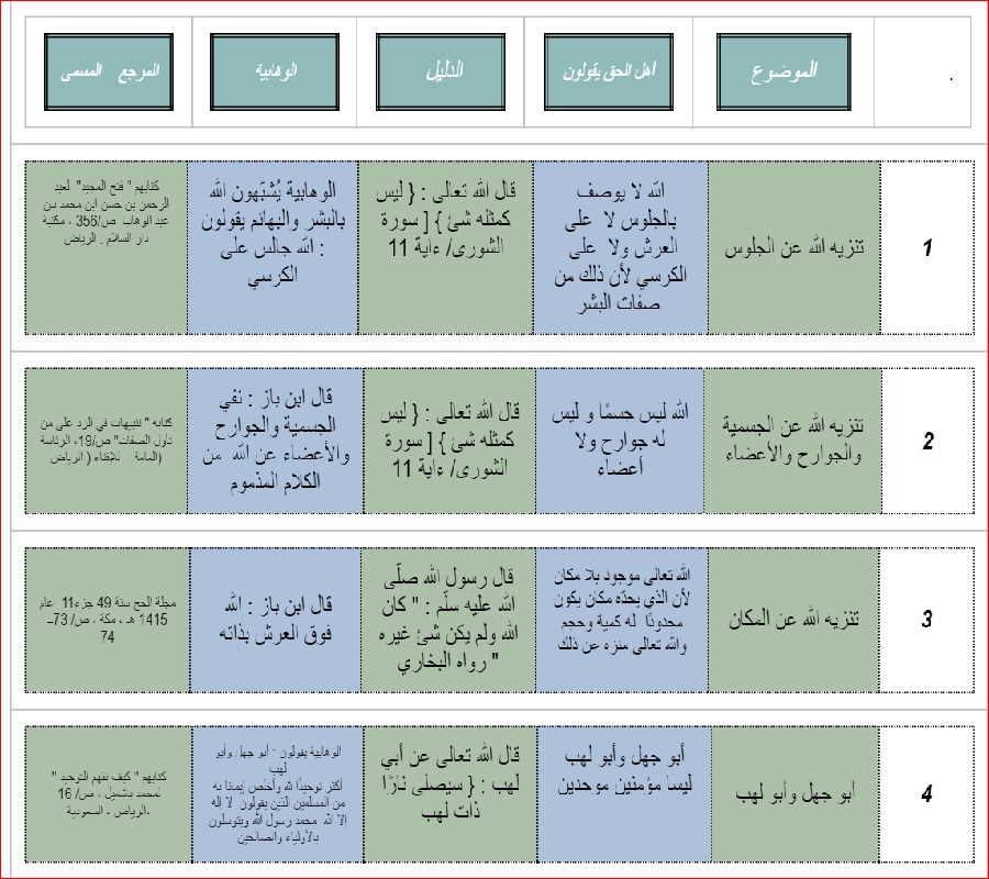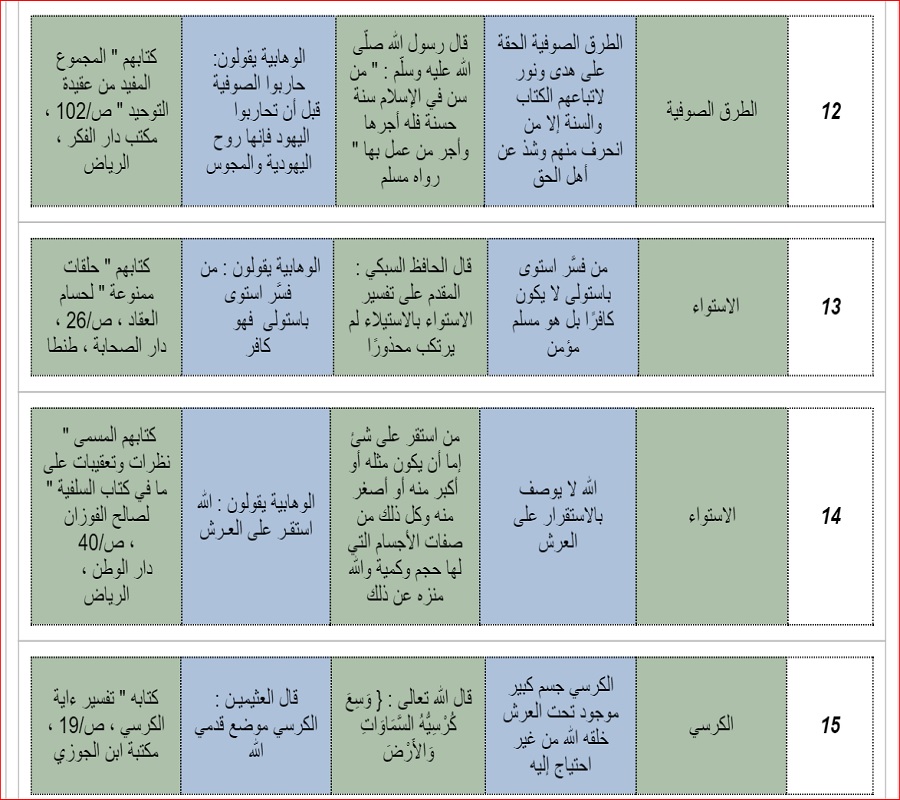 ومن خلال هذه اللائحة سيتضح للقارئ انحراف اقوال علماء الوهابية و فتاواهم عما عليه سائر العلماء قديما و حديثا ، فتراهم يشبهون الله بالبشر و البهائم و الجالس على كرسيه و كونه فوق العرش بذاته ، و نفي بعض علمائهم كون الاشاعرة و الماتريدية من اهل السنة و هذا ما يثبت انهم يعتبرون انفسهم المسلمين دون غيرهم ، فاليك هذه القائمة مع ذكر المصادر التي تدل على اقوالهم و فتاواهم ……