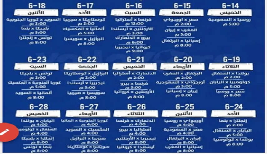 أولى المباريات سوف تكون بين المنتخب السعودي ومنتخب روسيا الدولة المستضيفة يوم 14 يونيو القادم، وذلك في الساعة الخامسة بتوقيت القاهرة، أما أولي مباريات المنتخب المصري فستكون مع أورجواي الساعة الثانية ظهرا بتوقيت القاهرة وإليكم جدول المباريات كاملا