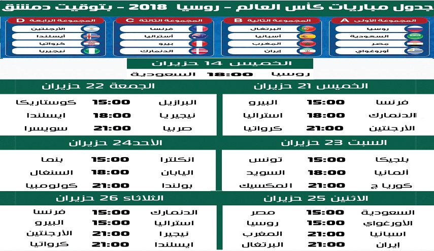 واليكم مواعيد مباريات دور المجموعات في كأس العالم روسيا 2018 التي سيكون يوم الخميس 14 يونيو/حزيران القادم. وجميع المباريات بتوقيت دمشق/ سوريا (+3 غرينتش).