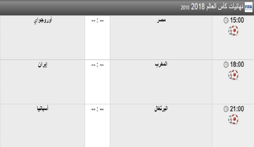 وتجري اليوم في توقيت بغداد {+3 ساعات عن توقيت غرينتش} ثلاث مباريات تجمع الأولى منتخبي مصر والأورغواي لحساب المجموعة الأولى في الساعة الثالثة عصراً.
