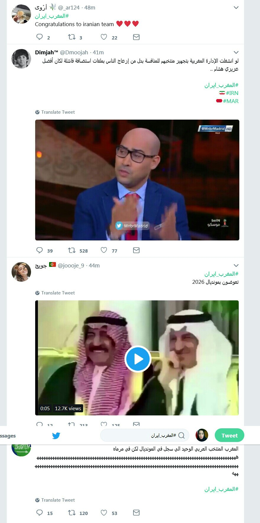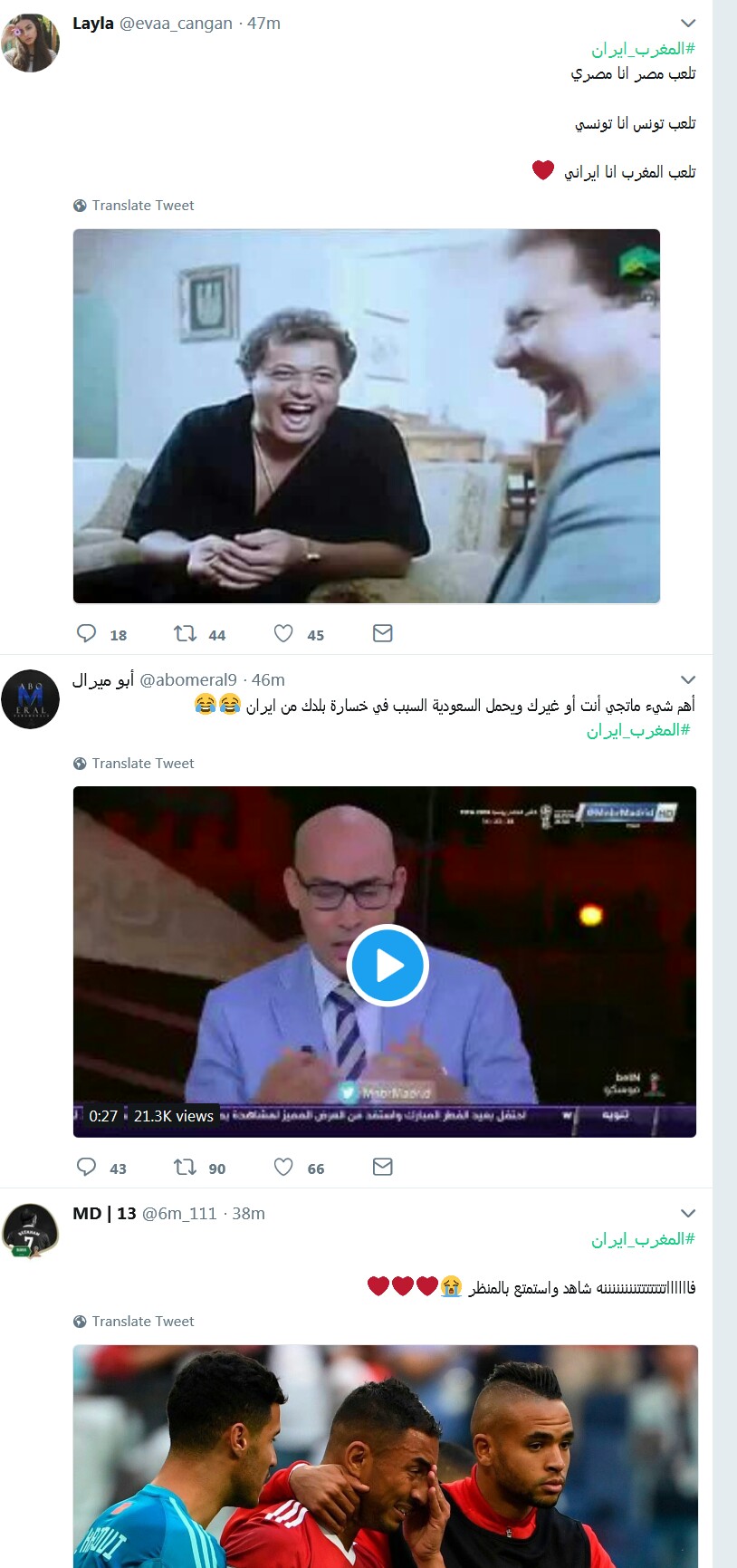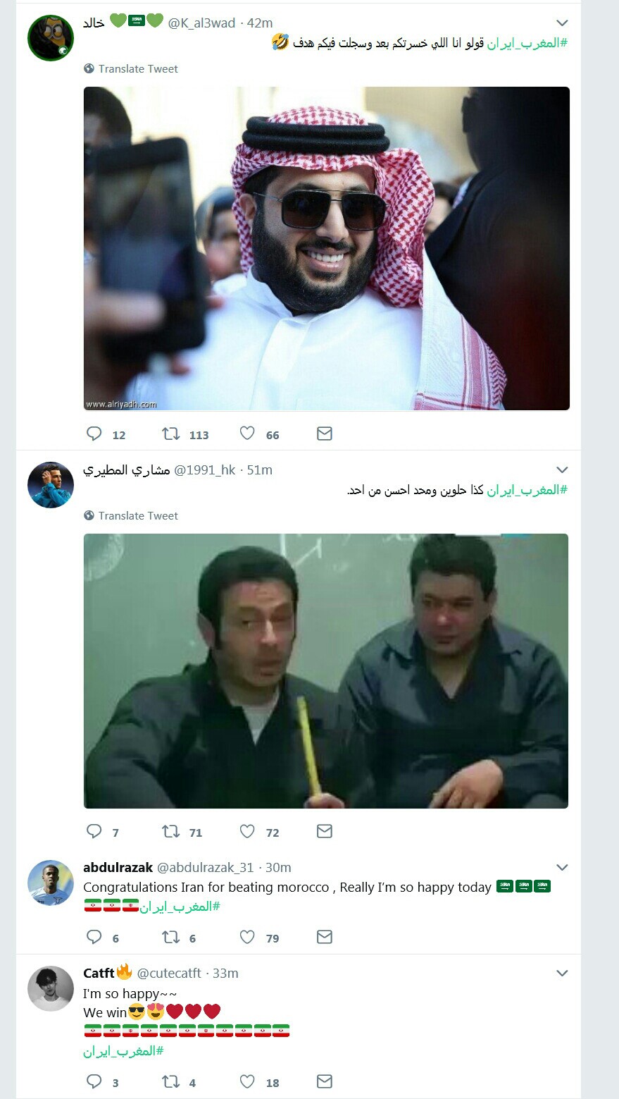 وبعد المباراة وفوز ايران، امتلأت مواقع التواصل الاجتماعي العربي وخصوصا في السعودية بالردود التي علّقت على هذا الفوز وهزيمة المغرب، فمنهم من سخر من أداء المغرب ومنهم من هنأ المنتخب الايراني على الفوز.