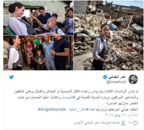 وتجولت أنجلينا جولي بين المباني التي قصفت في شوارع المدينة المنكوبة، والتقت بالأسر النازحة لمناقشة جهود إعادة بناء المدينة واحتياجات السكان العائدين.