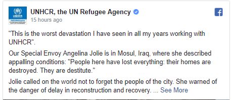 ونقل بيان عن الأمم المتحدة قولها إن "هذا أسوأ دمار شاهدته في كل سنوات عملي مع المفوضية. لقد فقد الناس كل شيء هنا، لقد دُمرت منازلهم. هم معدمون. ليس لديهم دواء لأطفالهم، والكثير منهم ليس لديهم مياه أو خدمات أساسية. إنهم محاطون بجثث تحت الأنقاض. ويحاولون الآن إعادة بناء منازلهم، بعد صدمة الحرب وغالباً بمساعدة ضئيلة أو معدومة".