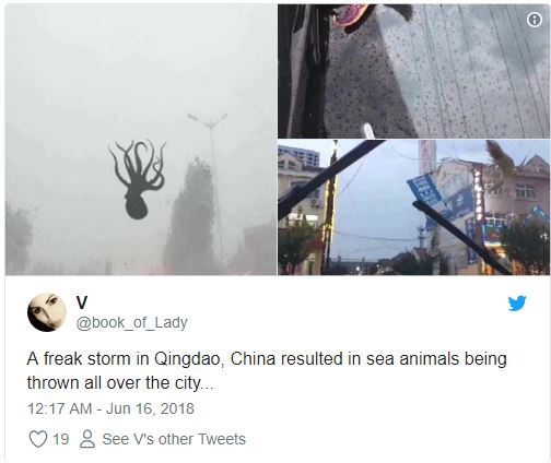 ونقلت صحيفة "دايلي ميل" عن هيئة الأرصاد الجوية الصينية أن الرياح القوية المصحوبة بالأمطار رفعت إلى الجو الكثير من الأحياء البحرية الصغيرة وقذفتها على بعد عدة مئات من الأمتار عن البحر.