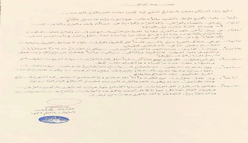 وأوصى زعيم التيار الصدري، الكتل السياسية بالسير قدما نحو تحقيق الحوارات الجادة من أجل تحقيق التحالفات المناسبة والتي تراعي الاصلاح الحقيقي.