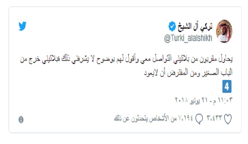 وقال تركي آل الشيخ في تغريداته: "تداول في اليومين الماضيين خبر إقالتي من منصبي.. متابعا: "ساءني كثيرا بعض الأشياء في الفترة الماضية ومنها، ظهور بلاتر الإعلامي وتصريحاته، فأنا لو كنت مكانه لخجلت على نفسي وتواريت عن الأنظار تماما خصوصا بعد الخروج من عالم الرياضة بفضيحة يندى لها الجبين".