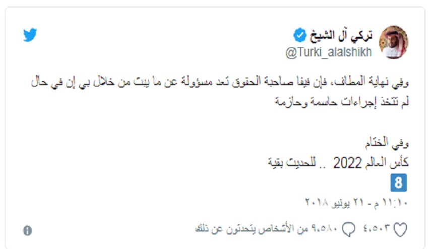 وكان تركي آل الشيخ، قد علق على نتيجة مباراة منتخب بلاده أمام المنتخب الروسي في بطولة كأس العالم 2018، وقال آل الشيخ في مقطع فيديو جديد، نشره عبر حسابه الرسمي بموقع تويتر: إنه يتحمل مسؤولية الخسارة الكبيرة للمنتخب السعودي في مباراة افتتاح كأس العالم