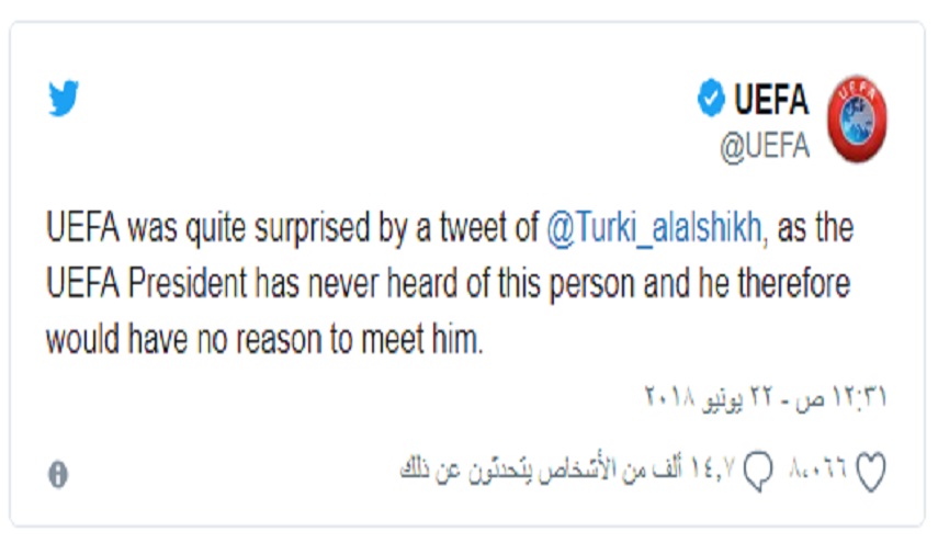 ولكن جاء رد "يويفا" على تغريدات تركي آل الشيخ، التي نشرها بالعربية والإنجليزية، قويا، حيث قالت: "الاتحاد الأوروبي لكرة القدم تفاجأ بتغريدات تركي آل الشيخ