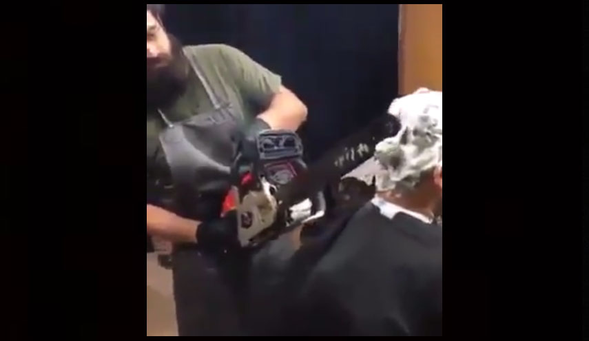 استخدم الحلاق المنشار الكهربائي لإزالة شعر رأس الرجل وتركه أصلع، وذلك دون أن يصيبه بأى جرح، وانتقد الكثيرون تلك الطريقة الغريبة التي ربما تتسبب في الإطاحة برأس الرجل أو على الأقل إصابته بشكل خطير.