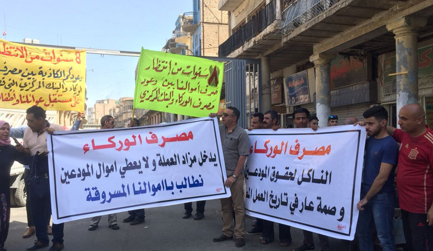 وقالت مصادر اعلامية ان العشرات من المواطنين تظاهروا صباح اليوم امام بوابة البنك المركزي العراقي في شارع الرشيد وسط بغداد، للمطالبة باموالهم المودعة في مصرف الوركاء.