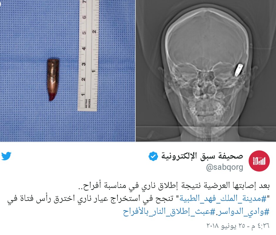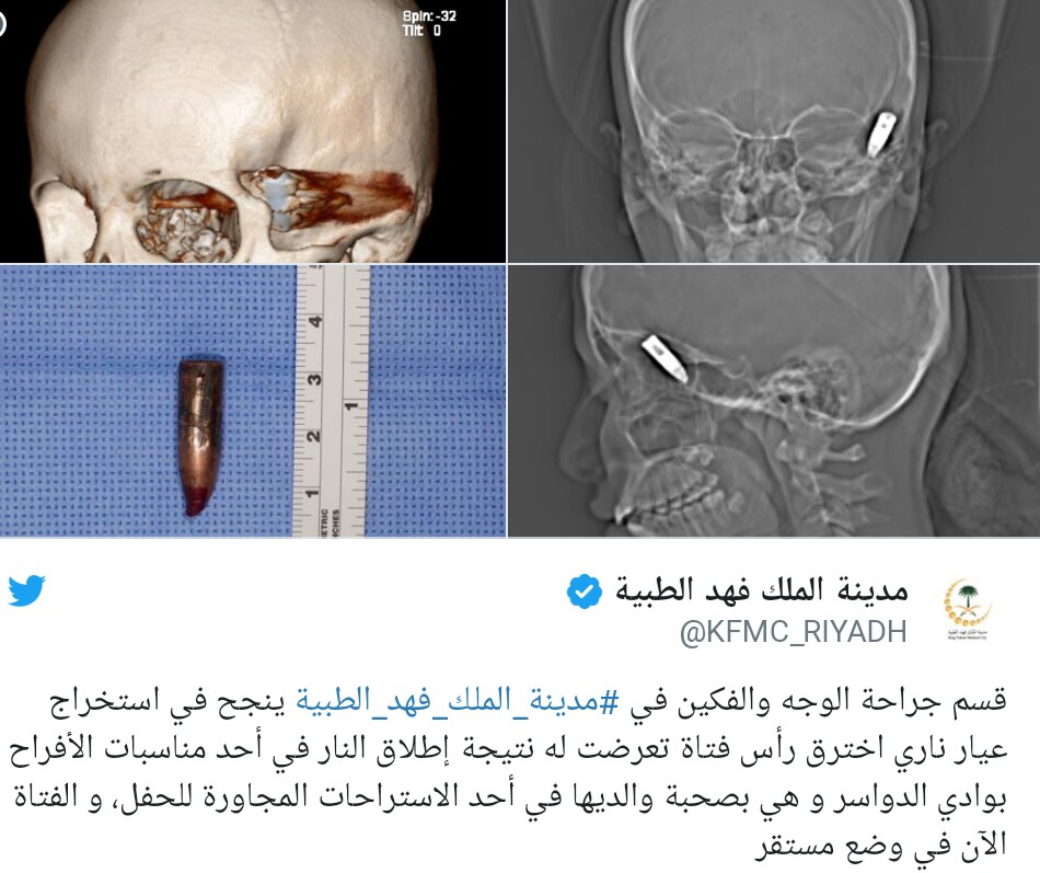 وذكرت المدينة الطبية على حسابها الرسمي في تويتر، أن جراحي قسم "جراحة الوجه والفكين" نجحوا في استخراج العيار الناري من رأس الفتاة ، مشيرة إلى أن حالتها الآن مستقرة.