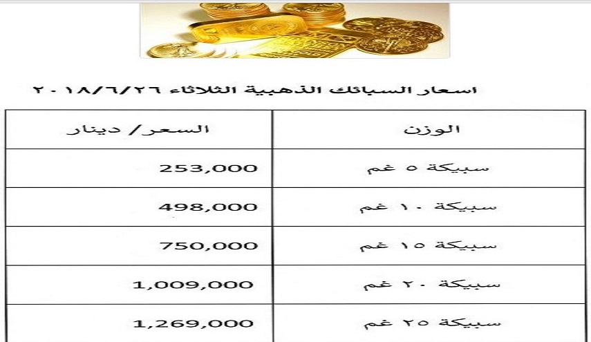 واوضح الجدول ان "سعر سبيكة 25 غم بلغت 1.269 مليون دينار وبانخفاض بلغ 15 الاف دينار، فيما افتقر الجدول من سبيكة 50 غم".