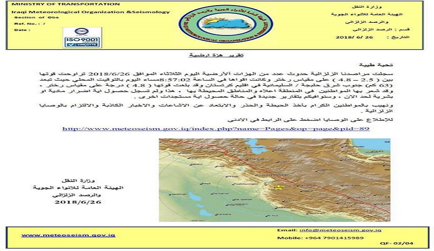 وقال القسم في تقرير له ان "المواطنين شعروا بهذه الهزات بالمنطقة المذكور والمناطق المحيطة بها"، مشيرا الى انه "لم يتم تسجيل اية اضرار مادية او بشرية لغاية الان".