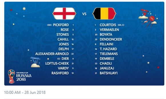 وفيما يلي التشكيلة الأساسية التي سيبدأ بها كل من المدير الفني لمنتخب إنجلترا، غاريث ساوثغيت، والمدير الفني لنظيره البلجيكي، الإسباني روبيرتو مارتينيز، هذه المباراة، على ملعب "كالينينغراد"، في الجولة الثالثة والأخيرة لدور المجموعات ضمن نهائيات بطولة كأس العالم لكرة القدم 2018:
