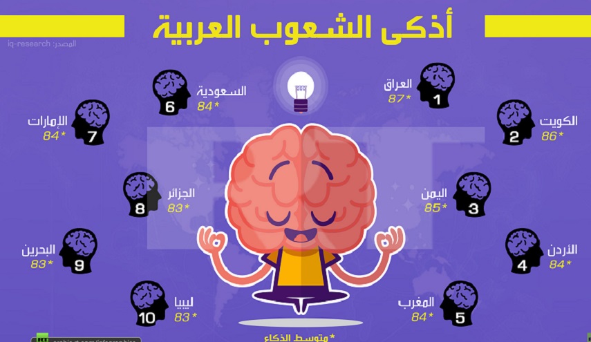 في الإنفوجرافيك التالي ترتيب لأذكى الشعوب العربية (IQ) بناءً على دراسة أجريت بين 2002-2006 من قبل عالم النفس البريطاني “ريتشارد لين” والبروفسور الفنلندي “تاتو فانهانين” حيث شملت الدراسة أكثر من 80 بلدا.