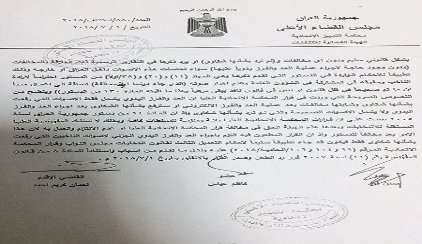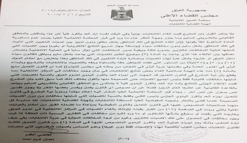 العراق_الكوثر: النص الكامل لقرار الهيئة القضائية للانتخابات التي ايدت فيه قرار المفوضية العليا المستقلة للانتخابات حول اجراء العد والفرز لنتائج الانتخابات البرلمانية .