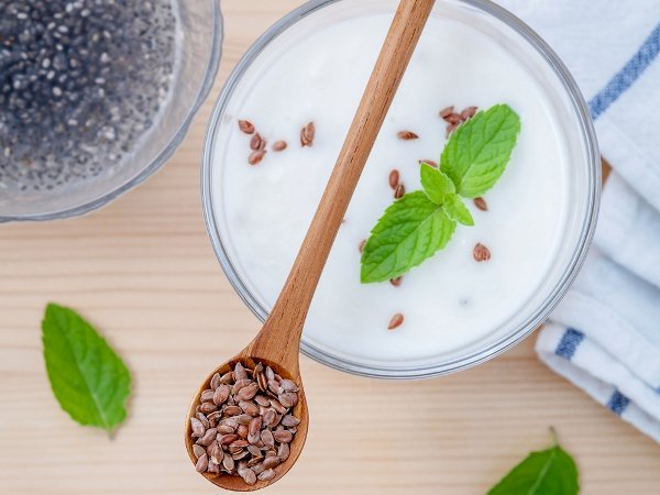 تُسحق بذور الكتان (ملعقة كبيرة) لتصبح ناعمة كالدقيق، فيُضاف الزبادي (250 غرامًا) إلى هذا المسحوق، ويُقلَّب المكوِّنان جيِّدًا.