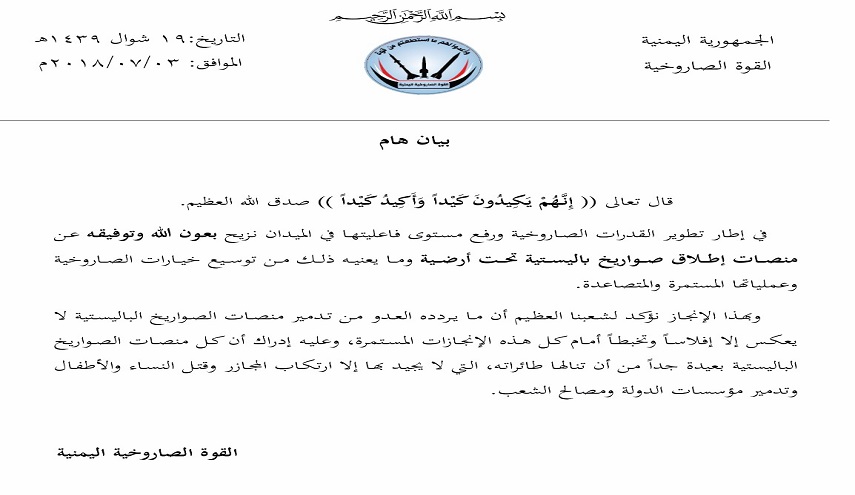 وأكدت القوة الصاروخية اليمنية في البيان أن هذا الإنجاز يؤكد للشعب اليمني أن مايردده تحالف العدوان السعودي عن تدمير منصات إطلاق الصواريخ الباليستية لا يعكس إلا إفلاساً وتخطباً أمام الإنجازات المستمرة.