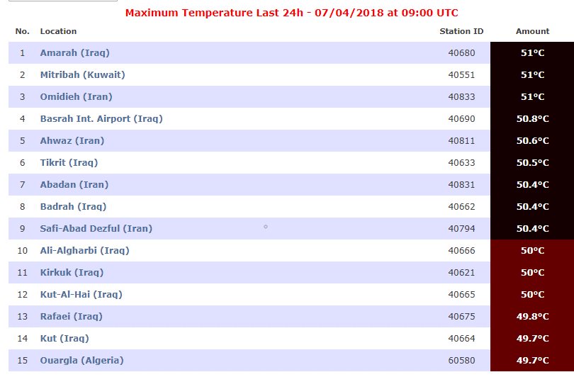 ونشرت محطة "بلاسيرفيلي" في كاليفورنيا الأمريكية، جدولا بأعلى درجات الحرارة في العالم خلال الـ24 ساعة الماضية، حيث بين الجدول ان مدينة العمارة العراقية سجلت اعلى درجة حرارة بالعالم والتي بلغت 51 درجة مئوية، تشاركها بنفس الدرجة كل من منطقة مطربة في الكويت والعمادية في ايران.