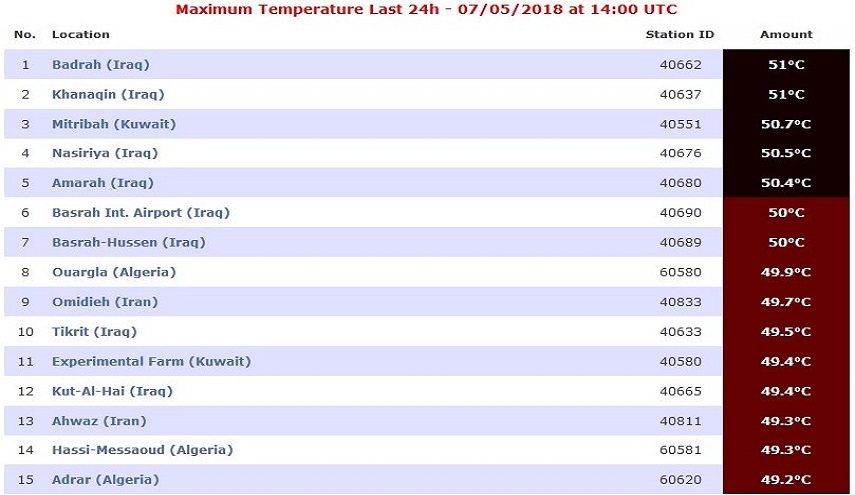 ونشرت محطة "بلاسيرفيلي" في كاليفورنيا الأمريكية، جدولا بأعلى درجات الحرارة في العالم، والتي بينت أن 8 مدنية عراقية من أصل 15 مدينة مدرجة بالجدول احتلت مراكز الأعلى بدرجات الحرارة في العالم.