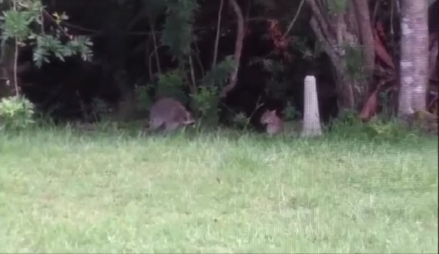 حيث قامت إحدى سكان فلوريدا بتوثيق فيديو في الفناء الخلفي لحديقة منزلها، وعلقت على الفيديو قائلة "إن لدى حيوان الراكون عدة أطفال صغار بالقرب من مكان المعركة، وأن الأم الشجاعة تصدت للحيوان المفترس، بينما اضطر الوشق إلى الهروب في النهاية". وأضافت "أن المعركة استمرت لفترة، حيث قام الراكون بحصر الوشق، وبالكاد تمكن من الفرار"