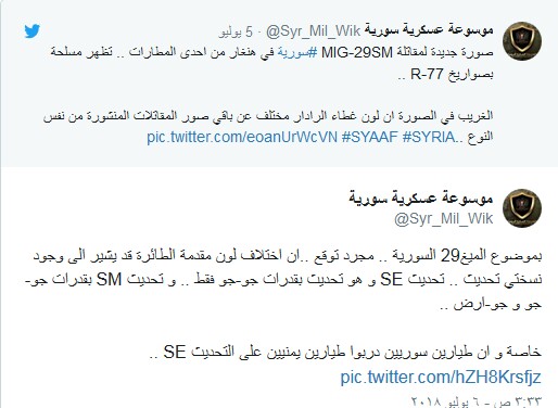 ويشار إلى أن القوات الجوية السورية تمتلك نحو 30 طائرة "ميغ-29" ذات تحديثات مختلفة.