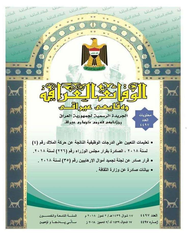 العراق-الكوثر: نشرت الجريدة الرسمية لجمهورية العراق تعليمات التعيين على الدرجات الوظيفية الناتجة عن حركة الملاك رقم 4 لعام 2018 الصادرة بقرار مجلس الوزراء قم 226 لسنة 2018.