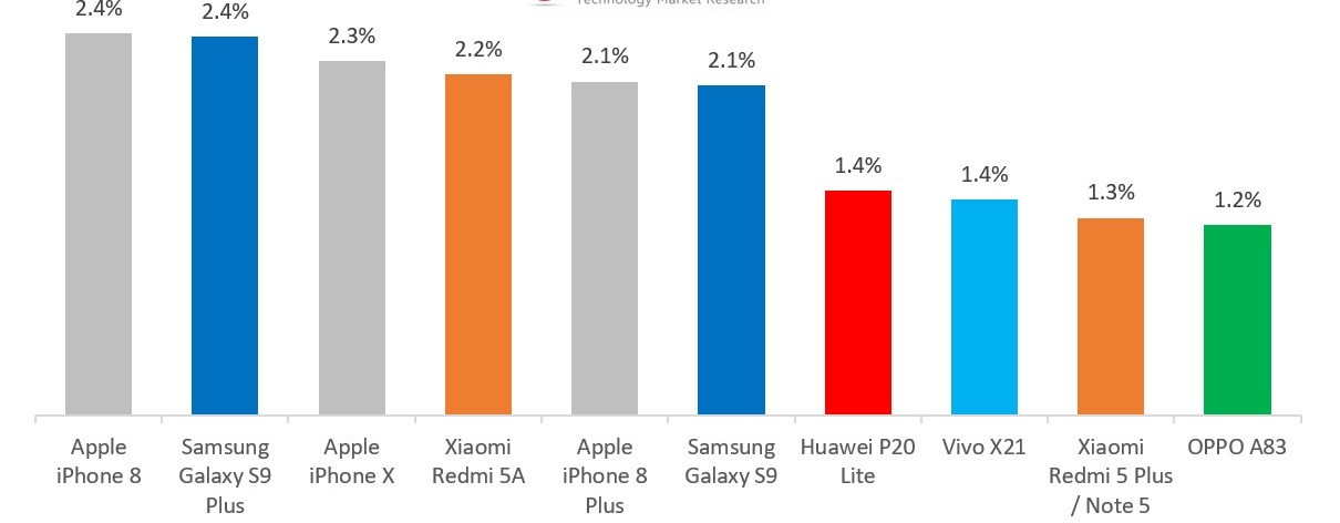 أما المرتبة الثالثة فاحتلها هاتف "آيفون- X" بشاشته المميزة التي جاءت على كامل مساحة الواجهة الأمامية للجهاز وميزة التعرف على وجه المستخدم، ولحقه هاتفا "Xiaomi Redmi 5A" و"iPhone 8 Plus".