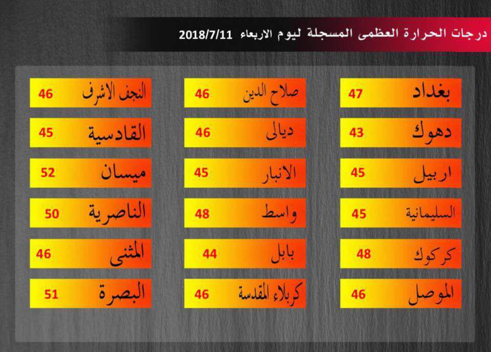 حيث اظهر جدول لدرجات الحرارة لجميع المحافظات ان محافظة ميسان احتلت المرتبة الاولى بدرجات الحرارة حيث بلغت فيها 52 درجة مئوية وتلتها محافظة البصرة حيث بلغت الحرارة 51 درجة مئوية .