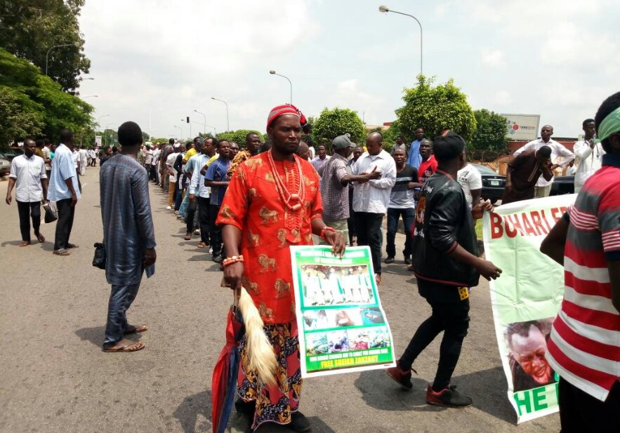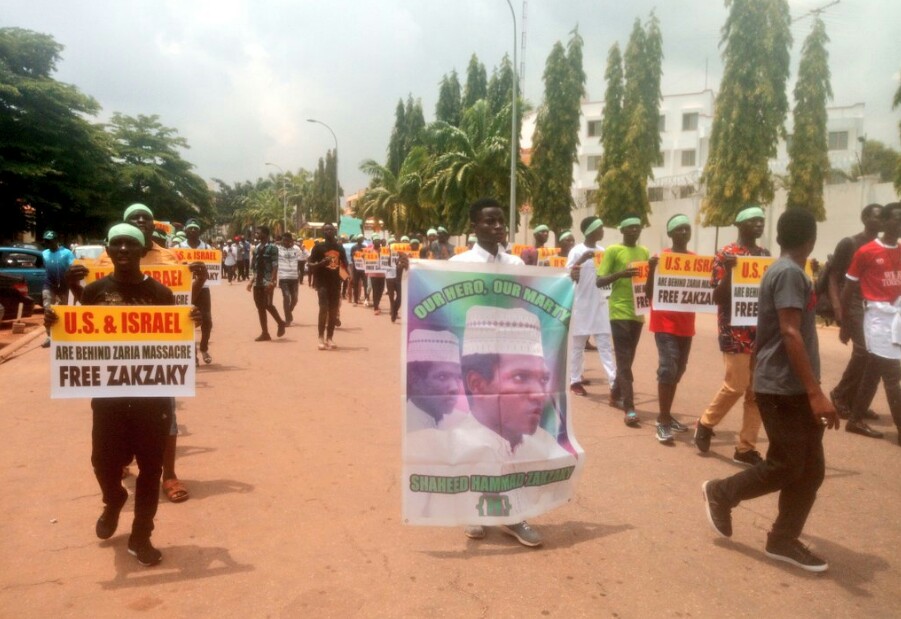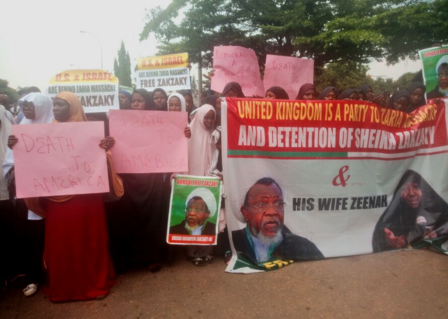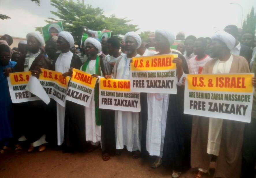 وطالب المحتجون الحكومات الغربية بالضغط على الحكومة النيجيرية لإطلاق سراح الشيخ الزكزاكي وزوجته اللذين يخضعان لقيد الإعتقال منذ نحو ثلاث سنوات بعد أن قمعت السلطات الأمنية النيجيرية أنصار الشيخ الزكزاكي حيث استشهد وأصيب العديد منهم إثر الممارسات الوحشية التي تقف وراءها بعض البلدان التي تدعي الإسلامية.