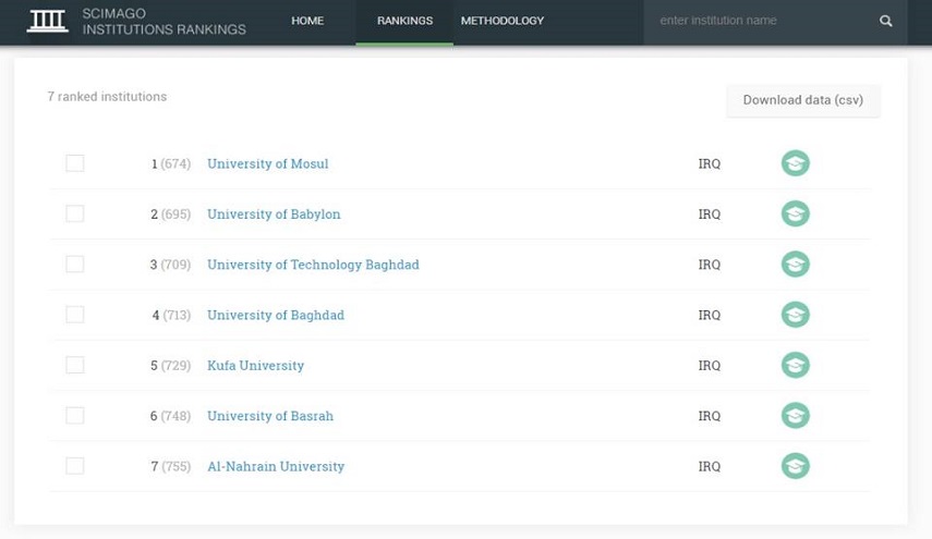 وقال المتحدث الرسمي للوزارة حيدر العبودي في بيان ان "جامعات الموصل وبابل والجامعة التكنولوجية وبغداد والكوفة والبصرة والنهرين حققت نسبا وحضورا في ميدان التنافس في هذا التصنيف". وأوضح ان "مؤشرات التقييم المعتمدة هي مؤشرات البحوث المنشورة في المستوعبات العالمية، والابتكارات، والتأثير المجتمعي"