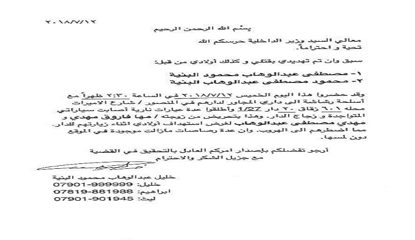 وقال بنية انه "في الساعة الثانية والنصف من ظهر اليوم تعرضت الى محاولة اغتيال مدبرة ومتعمدة من قبل محمود مصطفى عبد الوهاب وبتحريض من والده مصطفى عبد الوهاب ووالدته مها فاروق، حيث هاجم محمود بسلاح رشاش منزلي الواقع في شارع الاميرات بمنطقة المنصور غربي بغداد بوابل من الرصاص، ما ادى الى الحاق اضرار مادية بالمنزل واحدى السيارات".