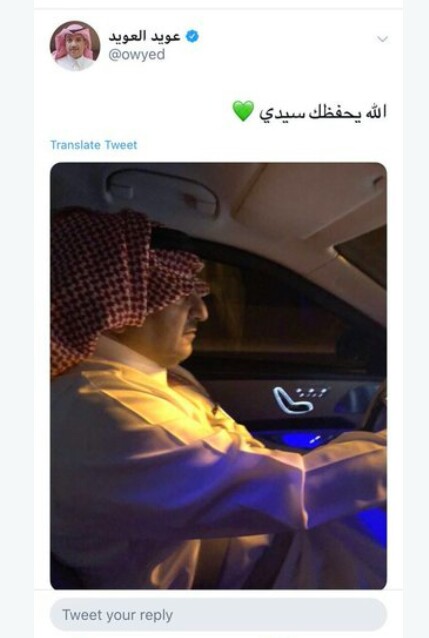 وكان عويد العويد قد نشر صورة في 10 تموز الحالي، ظهر من خلالها محمد بن نايف وهو يقود السيارة مرفقاً منشوره بعبارة “الله يحفظك سيدي”.