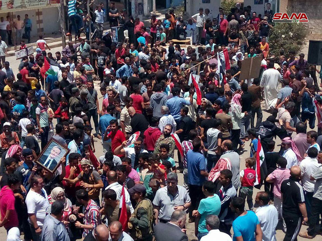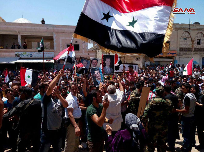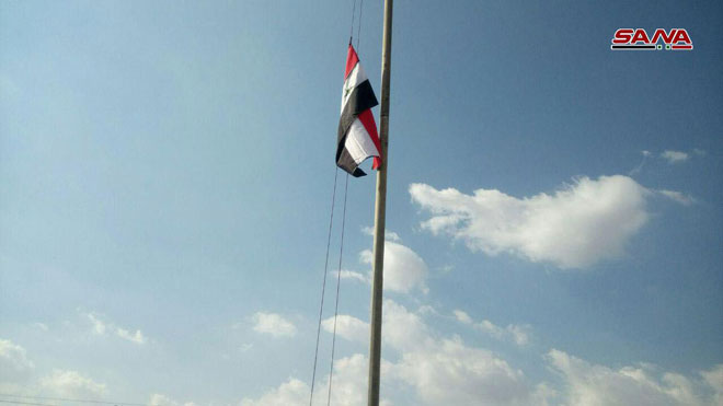 وأشار محافظ درعا محمد خالد الهنوس في تصريح للصحفيين خلال مشاركته في رفع العلم الوطني إلى أن رفع العلم الوطني في مدينة بصرى الشام “نصر عظيم نعتز به ويعتز به كل مواطن شريف ونعمل في الوقت الحاضر لتحقيق النصر الكامل بانهاء الوجود الإرهابي من درعا بالكامل”.