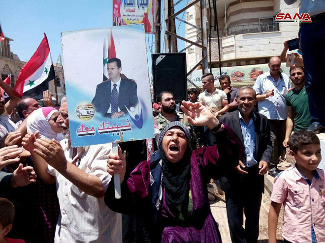 وتم في السادس من الشهر الجاري التوصل إلى اتفاق يقضي بوقف إطلاق النار في منطقة بصرى الشام وقيام المجموعات المسلحة بتسليم السلاح الثقيل والمتوسط في جميع المدن والبلدات وتسوية أوضاع من يرغب بالبقاء من المسلحين وخروج الإرهابيين الرافضين للتسوية مع عائلاتهم إلى إدلب واستلام الدولة السورية كل نقاط المراقبة على طول الحدود السورية الأردنية إضافة إلى عودة الأهالي الذين خرجوا من مدنهم وبلداتهم إليها وعودة مؤسسات الدولة لتمارس عملها في المدن والبلدات بعد خروج الإرهابيين غير الراغبين بتسوية أوضاعهم.