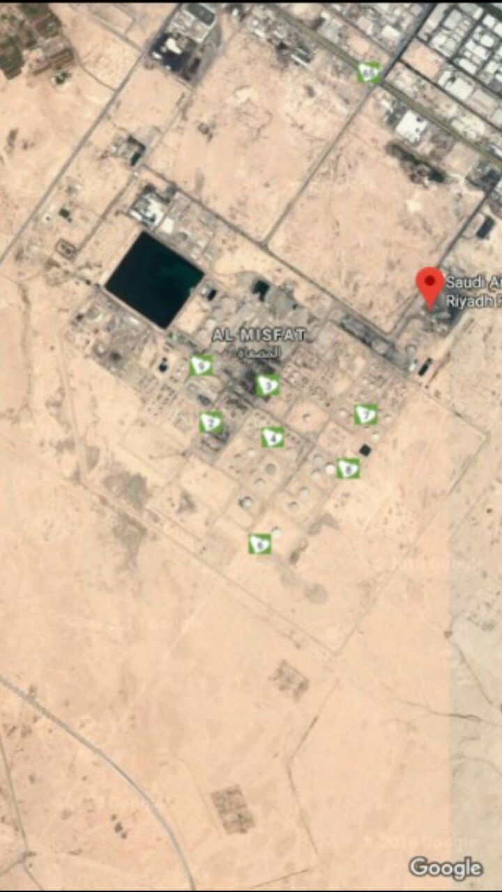 وتم نشر صورة جوية من موقع غوغل لمصفاة الرياض وخزاناتها ومقر شركة ارامكو والتي تقع بالقرب من المدينة الصناعية الكبرى في العاصمة السعودية.
