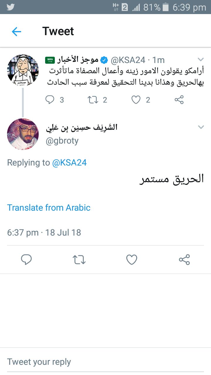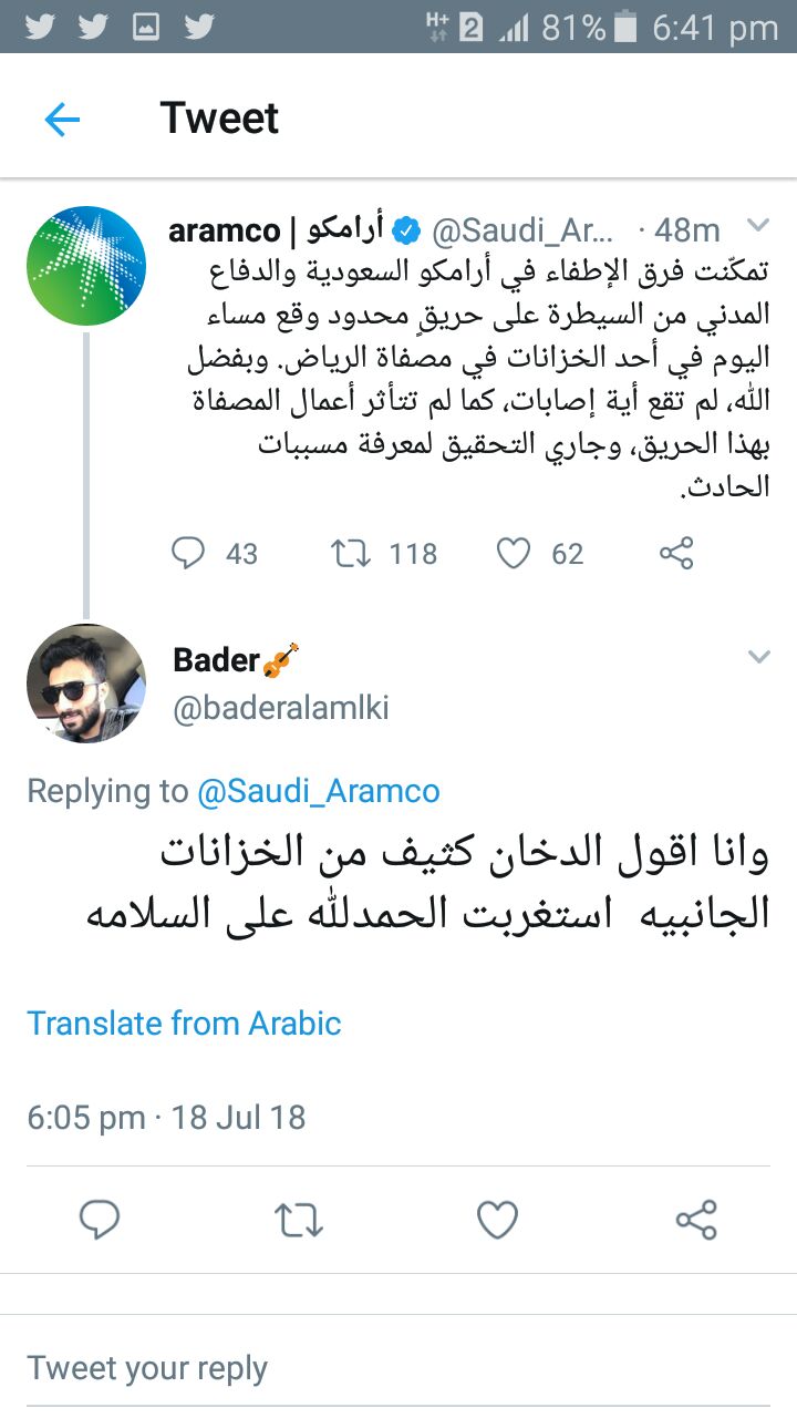 وكشف مغردون سعوديون في حساباتهم مساء الاربعاء ان الحريق لازال مستمرا في خزانات مصفاة شركة ارامكو'>مصفاة شركة ارامكو في الرياض رغم اعلان الاخيرة انه تم اخماد الحريق مساء الاربعاء.