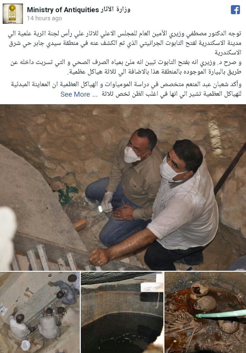 وتوجه الأمين العام للمجلس الأعلي للآثار مصطفي وزيري، على رأس لجنة أثرية علمية إلي مدينة الإسكندرية لفتح التابوت الجرانيتي الذي تم الكشف عنه في منطقة سيدي جابر حي شرق الأسكندرية.