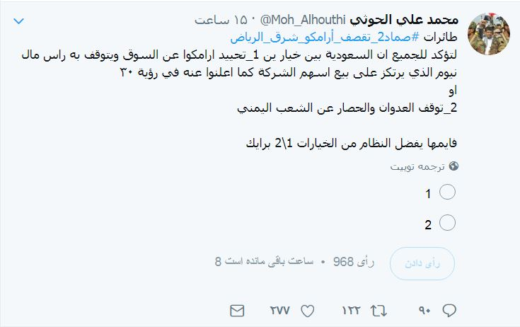 وقال الحوثي في تغريدة عبر "تويتر"، إن "طائرات صماد2 قصفت أرامكو شرقي الرياض، لتؤكد للجميع أن السعودية بين خيارين".