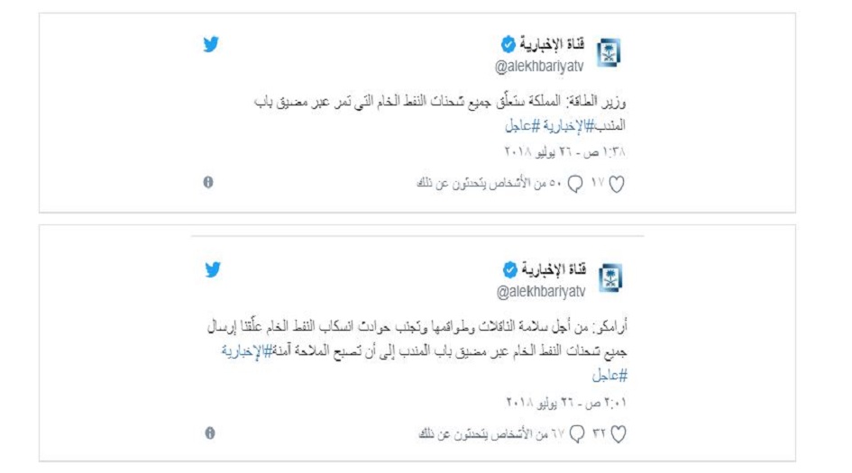 وحاولت السعودية ان تخفي الحقيقة واصرت على أنها ناقلة نفط، وقالت انها علقت كل شحنات النفط عبر باب المندب لتاتي تغريدة المدون السعودي الشهير "مجتهد" لتكشف السبب وراء اخفاء السعودية لنوع السفينة المستهدفة، حيث أعلن أن السفينة التي ضُربت الأربعاء قرب مضيق باب المندب "كانت بارجة حربية سعودية".
