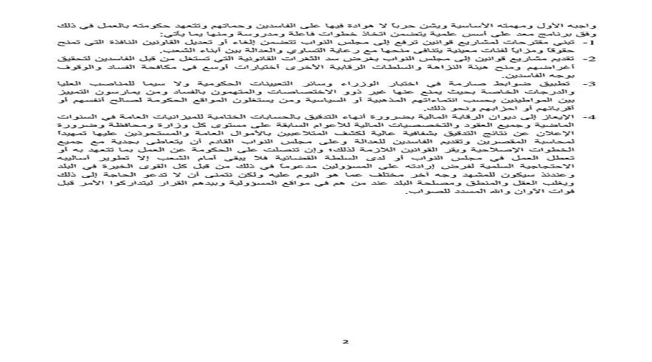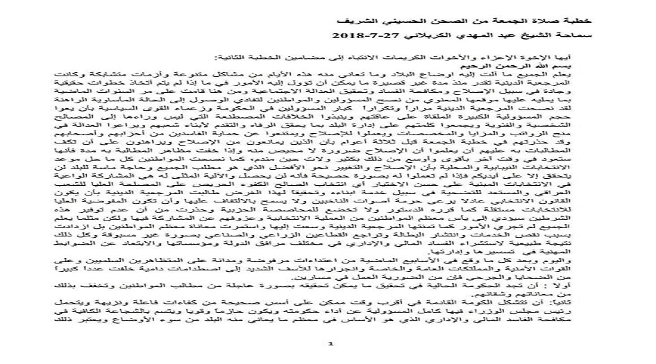 ودعا السيستاني في الخطبة، التي ألقاها ممثل عنه في مدينة كربلاء، حكومة رئيس الوزراء حيدر العبادي المنتهية ولايتها إلى تلبية مطالب المحتجين بتوفير وظائف وتحسين الخدمات الأساسية.