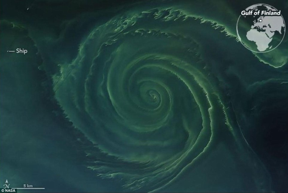 ويبدو أن دوامات الطحالب تنتشر على مسافة 15 ميلا على الأقل، ما يعني أن جزيرة مانهاتن في مدينة نيويورك، على سبيل المثال، يمكن أن تختفي داخلها تقريبا.