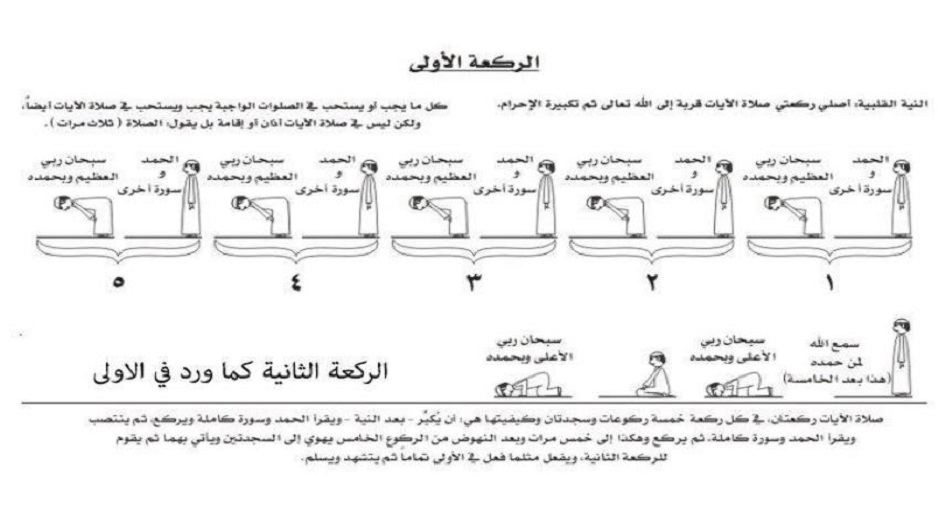 صلاة الآيات ركعتان، في كل واحدة خمسة ركوعات ينتصب بعد كل واحد منها، وسجدتان بعد الانتصاب من الركوع الخامس، ويتشهد بعدهما ثم يسلم، وتفصيل ذلك أن يحرم مقارناً للنية كما في سائر الصلوات، ثم يقرأ الحمد وسورة ثم يركع، ثم يرفع رأسه منتصباً فيقرأ الحمد وسورة ثم يركع، وهكذا حتى يتم خمسة ركوعات، ثم ينتصب بعد الركوع الخامس، ويهوي إلى السجود، فيسجد سجدتين ثم يقوم ويصنع كما صنع أولاً، ثم يتشهد ويسلم.