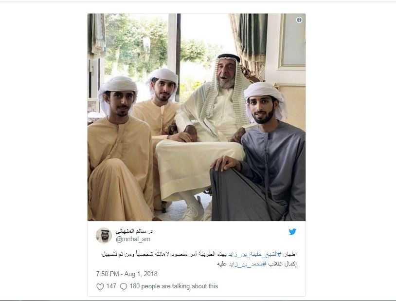 ويظهر خليفة بن زايد ـ رئيس الإمارات الحاضر الغائب ـ في الصورة التي نشرها “المنهالي” في تغريدة له عبر حسابه بتويتر، بوضع صحي حرج ومظهر يرثى له وسط أفراد الشباب من العائلة الحاكمة.