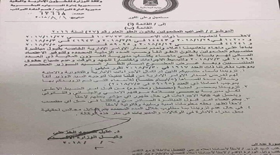 وجاء في الوثيقة "لاحقا لتعاميمنا ذوات الاعداد 103723 في 22 / 11 / 2017 و 44241 في 12 / 5 / 2018 و 590 95 في 5 / 7 / 2018 وبناءً على ماجاء في في تعاميمنا اعلاه ولعدم اصدار الاوامر الادارية الخاصة بقبول مباشرة منتسبيكم المشمولين بقانون العفو العام وحسب المدة الزمنية المحددة ولتوفير الاعتماد المالي لهم بناءً على ماجاء بكتاب مديرية الشؤون المالية ذي العدد 10294 في 3 / 7 / 2018 ولتبسيط الاجراءات واختصارا للجهد والوقت وعدم ضياع حقوق المنتسبين بعد عرض الموضوع امام انظار الوزير وبموجب مذكراتنا ذات العدد 1617 في 30 / 7 / 2018 تقرر مايلي" :