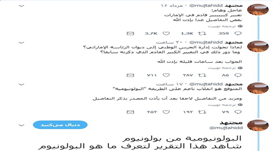 وفي تغريدة أخرى بعد ساعات من هذه التغريدة، توقع حساب مجتهد "انقلابا ناعما على الطريقة البولونيومية"، في إشارة إلى حادثة اغتيال عميل المخابرات الروسي ألكسندر ليتفينينكو بمادة البولنيوم في العام 2006.