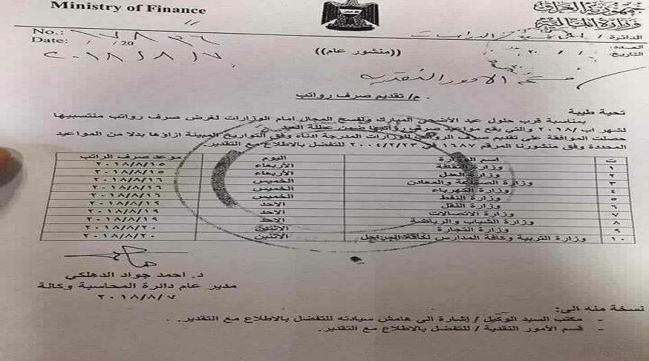 وبحسب الوثيقة التي اصدرها مدير عام دائرة المحاسبة بالوزارة بتقديم صرف الرواتب لعشر وزارات قبل تاريخ 21 اب الحالي، وذلك لوقوع صرف رواتبها مع عيد الاضحى، مبينة ان :تاريخ توزيع هذه الرواتب سيكون ابتداء من 15 اب وتنتهي بـ 20 اب".